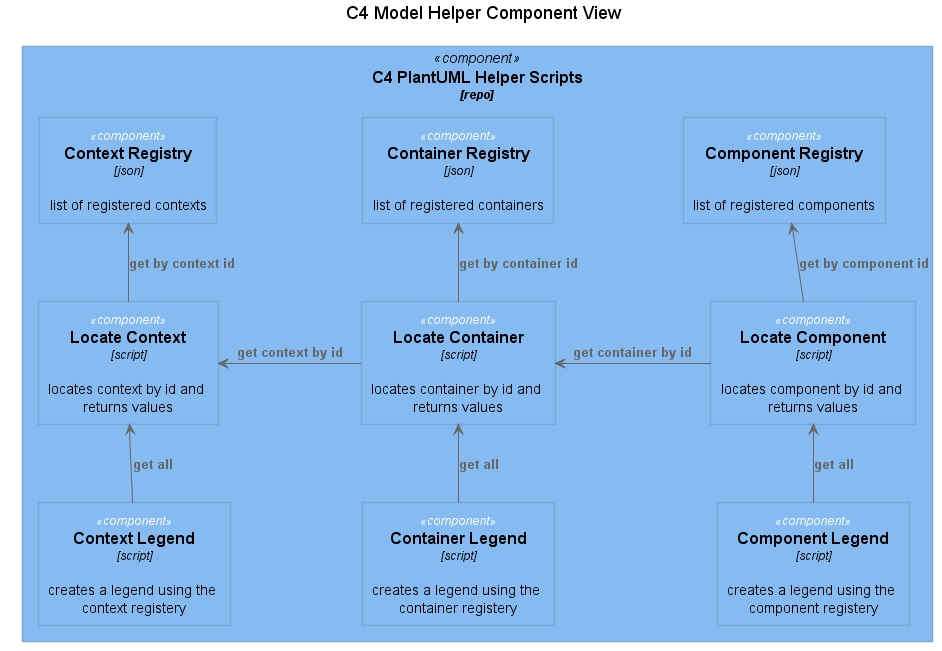 The C4 Helper allows a the modeller to register context, container and component object. The registration includes descriptions, technology and importantly an URL link will be used to navigate up and down the C4 levels.